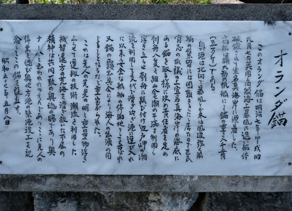 1872年、英国商船「ベナレス号」が宜名真沖で座礁・沈没した際、漂着した船員4名の遺体を埋葬した場所です。地元では西洋人を「ウランダー」と呼んでいたことから「オランダ墓」と名付けられましたが、実際にはオランダとは関係なく、欧米人全般を指す呼称だったそうです。